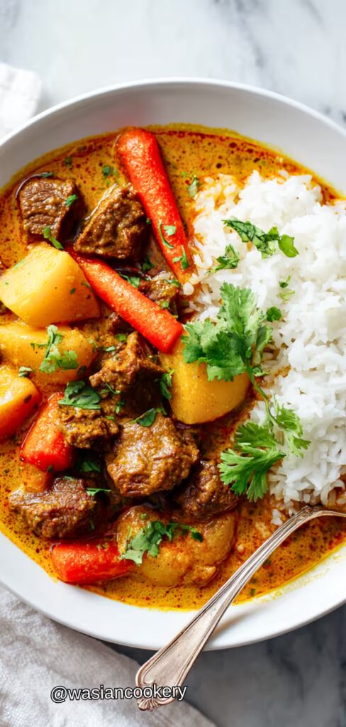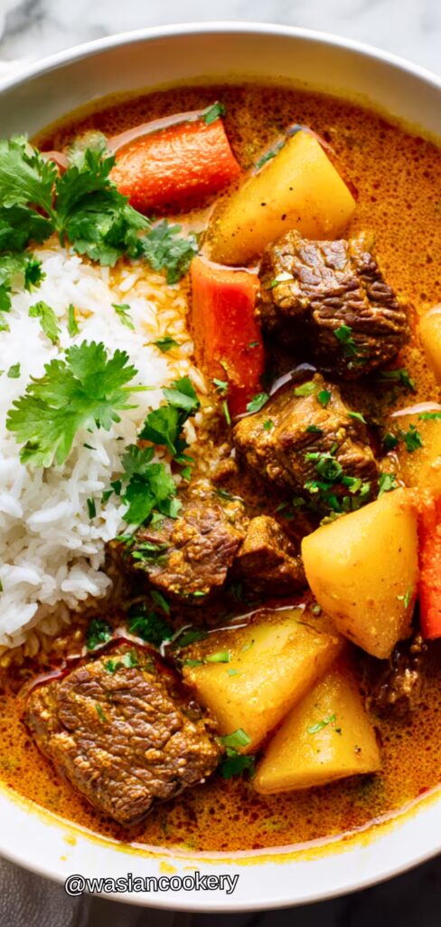 I like how the beef becomes soft and juicy as it cooks, soaking up all the spices and coconut milk. The onions, garlic, and ginger blend seamlessly into the sauce, making it creamy and full of depth. Whether I add potatoes, carrots, or keep it simple, the curry always turns out thick, flavorful, and satisfying.