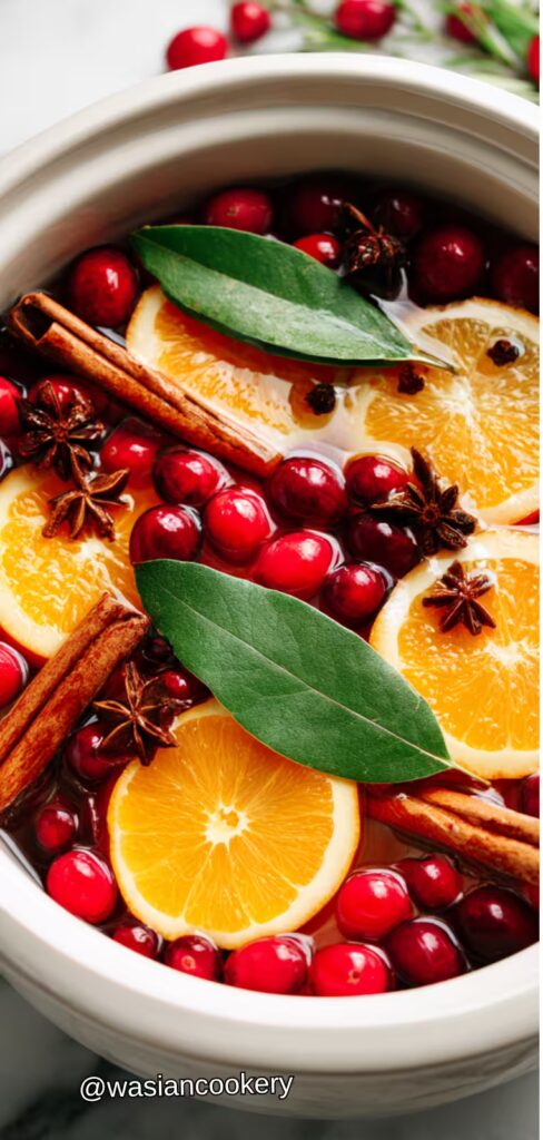 This traditional simmer pot fills your home with the quintessential scents of Christmas using cinnamon, oranges, and cranberries. It’s the perfect natural air freshener that creates an instant holiday atmosphere without any artificial fragrances.