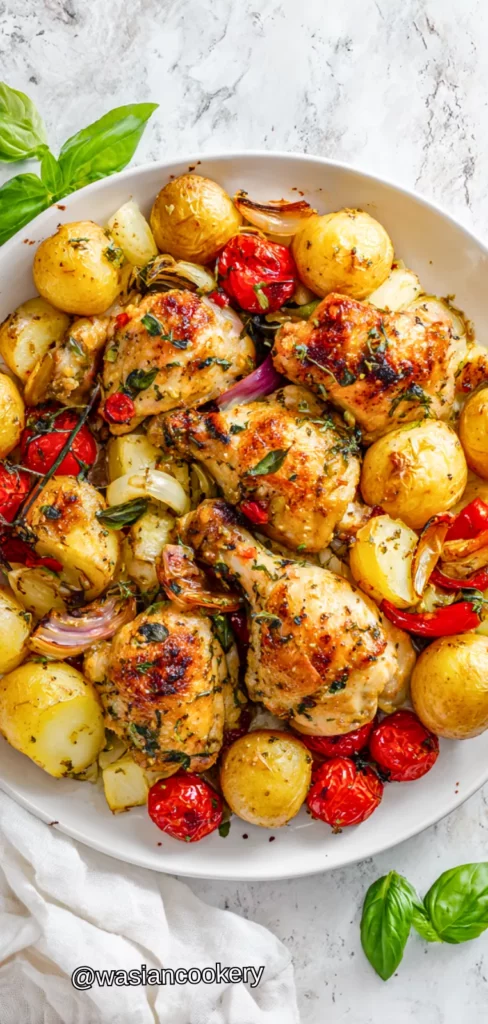 This classic one-pan dinner features juicy roasted chicken and tender potatoes seasoned with herbs and roasted to perfection. The chicken and potatoes cook together, with the potatoes absorbing all the delicious juices from the chicken. This simple, satisfying meal is perfect for Sunday dinners or feeding a hungry family.
