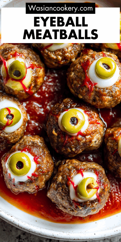 These meatballs work beautifully as appetizers with other spooky foods like mummy-wrapped hot dogs, spider deviled eggs, and witch hat crackers. Serve in black bowls or Halloween-themed dishes for extra atmosphere. Kids love it when you name each eyeball after monsters like “Dracula’s dinner” or “Zombie snacks.”