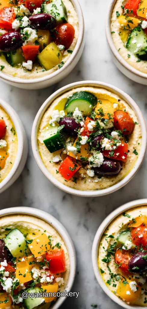 These colorful cups feature creamy hummus topped with fresh, crunchy vegetables, making them a protein-packed snack. They’re easy to prep ahead and provide a satisfying combination of fiber, healthy fats, and vitamins.