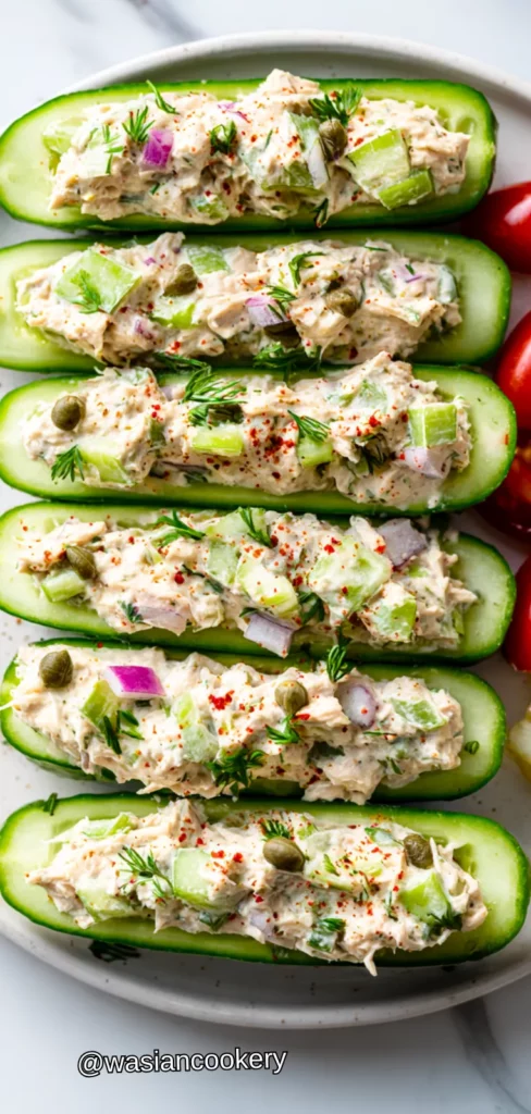 - Fill the boats by spooning the tuna salad generously into each cucumber boat, mounding it slightly. Use all the tuna salad, dividing it evenly among the four boats.