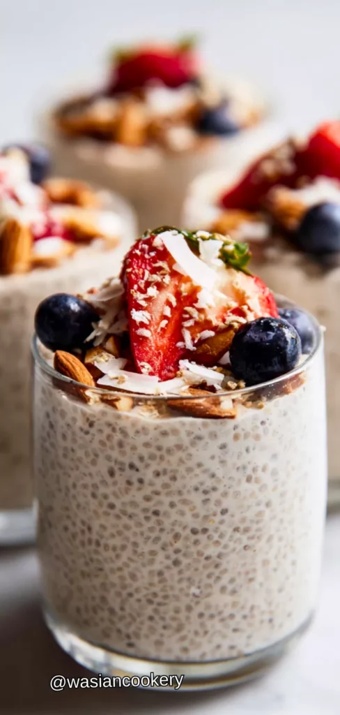 - Add toppings just before eating by layering or arranging fresh berries, a sprinkle of granola, sliced almonds, and coconut flakes on top. The toppings add texture and make the pudding more interesting.