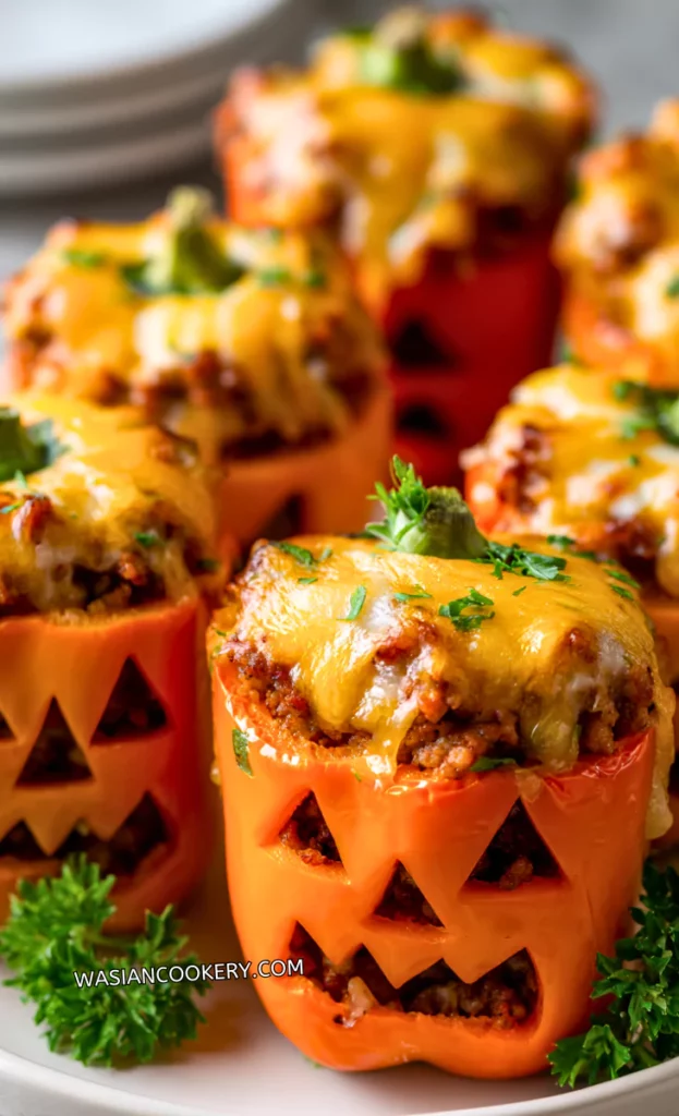 For freezing, wrap each cooked pepper individually in plastic wrap, then foil. Freeze up to three months for quick Halloween dinners. Thaw overnight in the fridge, then reheat covered at 350°F until hot throughout.