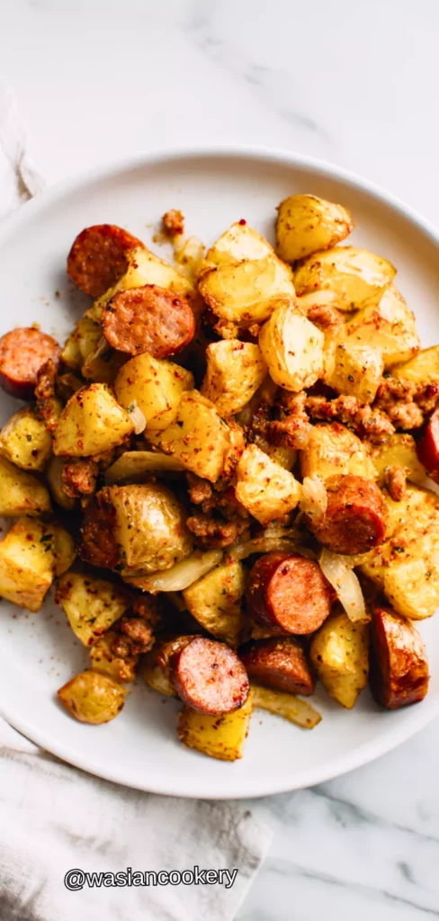 This one-pan sausage and potatoes dinner is a comforting and filling option when you want a hands-off meal. Everything cooks together in the oven, which keeps preparation and cleanup simple. The potatoes turn soft on the inside with lightly crisp edges, while the sausage adds deep flavor. It’s a reliable lazy dinner that feels complete on its own.