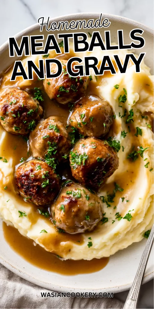 Keep leftovers in an airtight container in the refrigerator for up to 3–4 days. Let the meatballs cool completely before storing so the gravy doesn’t separate or turn watery. If you want to freeze them, store meatballs and gravy together in a freezer-safe container for up to 2 months.