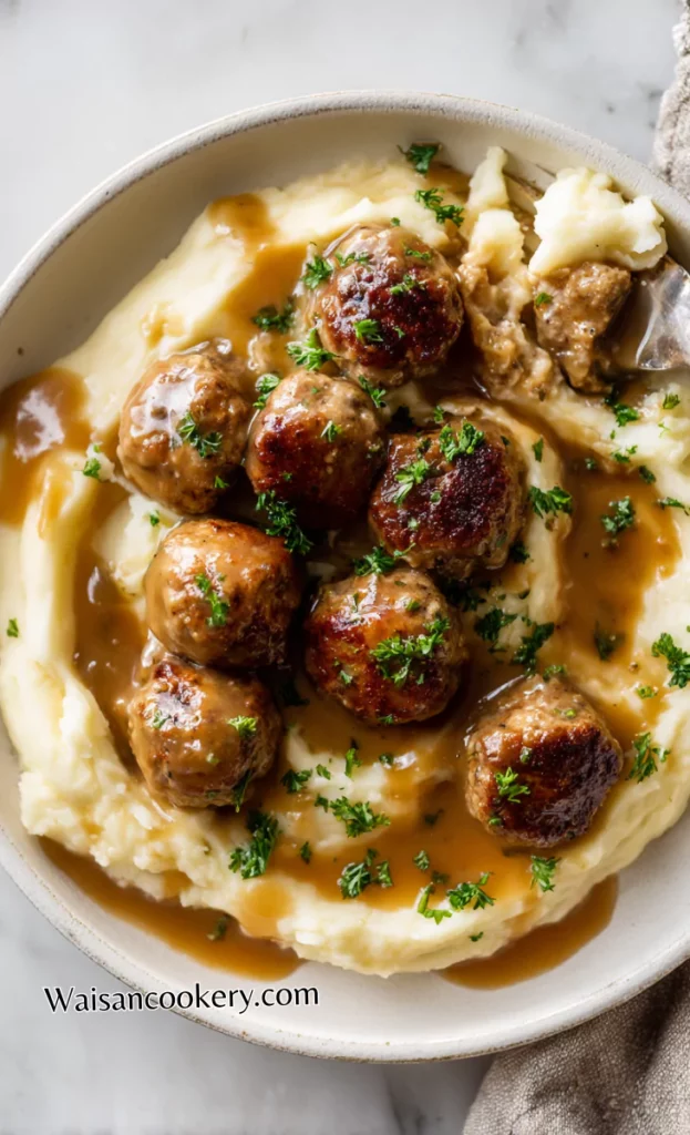 - Combine: Return meatballs to the skillet, spoon gravy over the top, and simmer for 8–10 minutes until the meatballs are cooked through.
