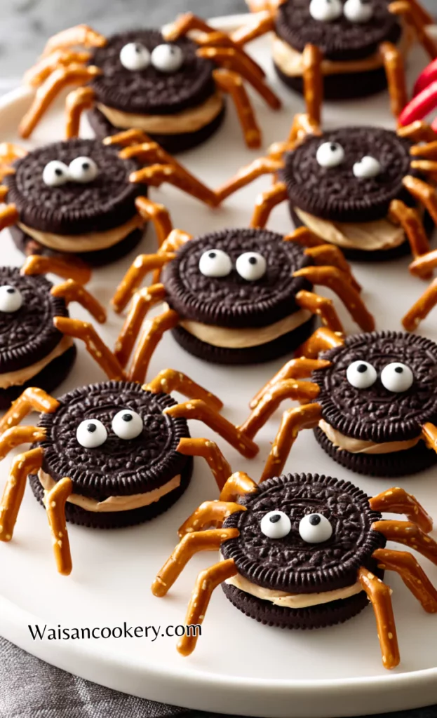 - Create spider body: Spread peanut butter mixture on cookies with filling. Top with plain cookie halves to create double-stuffed cookies.