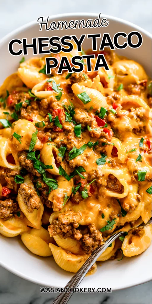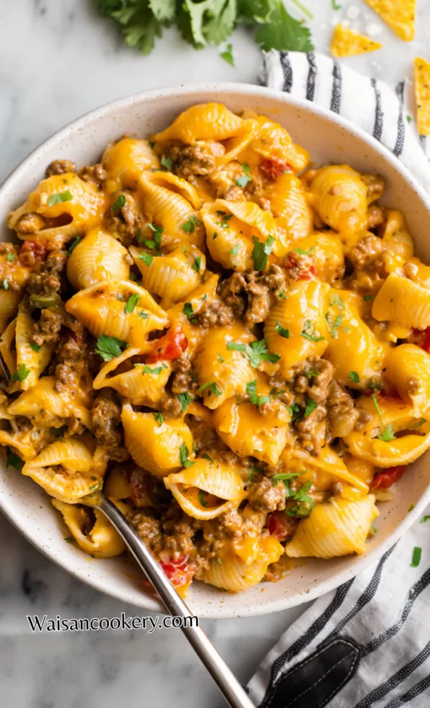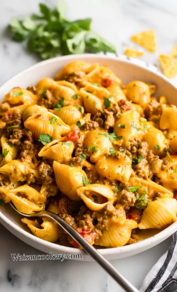 That said, you can make it lighter by using lean ground turkey, whole wheat pasta, reduced-fat cheese, and adding veggies like peppers or spinach. Small swaps make it healthier while keeping the same bold, cheesy taco flavor.